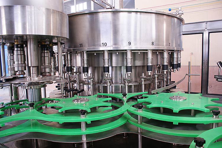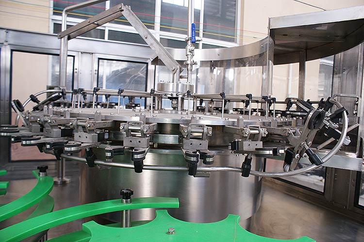 瓶子由通過風送道傳遞,然后通過撥瓶星輪傳送至三合一機的沖瓶機。沖瓶機回轉(zhuǎn)盤上裝有瓶夾,瓶夾夾住瓶口沿一導軌翻轉(zhuǎn)180°,使瓶口向下。在沖瓶機特定區(qū)域,沖瓶夾噴嘴噴出沖瓶水,對瓶子內(nèi)壁進行沖洗。瓶子經(jīng)沖洗、瀝干后在瓶夾夾持下沿導軌再翻轉(zhuǎn)180°,使瓶口向上。洗凈后的瓶子通過撥瓶星輪由沖瓶機導出并傳送至灌裝機。進入