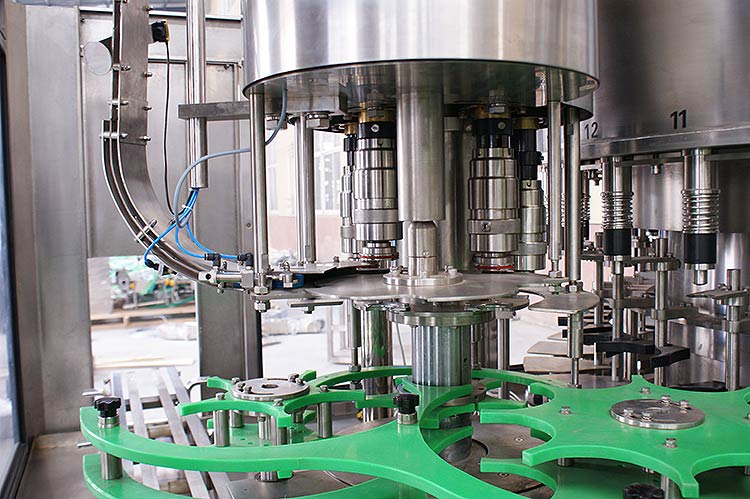 純凈水灌裝機的瓶子由瓶頸托板卡住并在凸輪作用下將瓶子上升,然后由瓶口將灌裝閥頂開。灌裝閥打開后物料通過灌裝閥完成灌裝過程,灌裝結(jié)束后瓶口下降離開灌裝閥,瓶子通過卡瓶頸過渡撥輪進入旋蓋機。旋蓋機上的止旋刀卡住瓶頸部位,保持瓶子直立并防止旋轉(zhuǎn)。旋蓋頭在旋蓋機上保持公轉(zhuǎn)并自轉(zhuǎn),在凸輪作用下實現(xiàn)抓蓋、套蓋、旋蓋、脫蓋動作,完成整個封蓋過程。成品瓶通過出瓶撥輪從旋蓋機傳送到出瓶輸送鏈上,由輸送鏈傳送出三合一機。