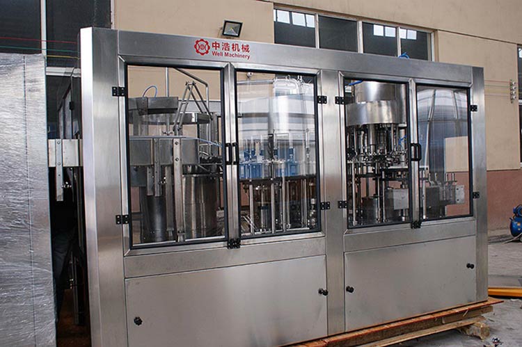 三合一灌裝機(jī)的結(jié)構(gòu)緊湊,控制系統(tǒng)完善,操作方便,自動(dòng)化程度高。